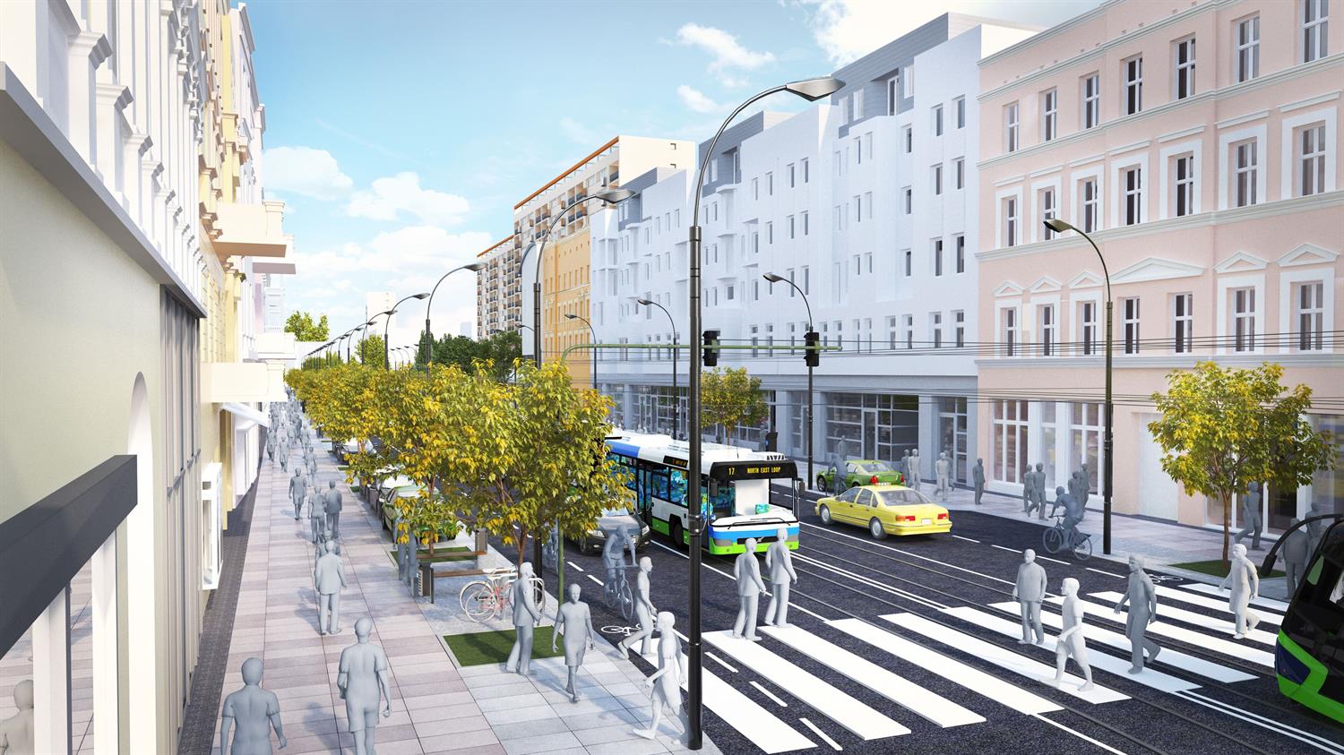 Trzeci wariant mówi również o układzie jednej jezdni, ale z czterema pasami ruchu po dwa w każdym kierunku, przy jednoczesnym ich zwężeniu w stosunku do tego, co jest teraz, do 3 m, by można było wydzielić pasy jednokierunkowe dla rowerów (szer. 1,6 m). Chodniki szerokości od 2,9 m do 16 m. To druga z wersji bez tramwaju, z dopuszczalną prędkością jazdy 50 km/h i z parkowaniem równoległym do jezdni na całej długości przy stałej liczbie miejsc postojowych dla 80 aut, nie licząc tych dla osób niepełnosprawnych i dla zapewnienia dostaw towarów.