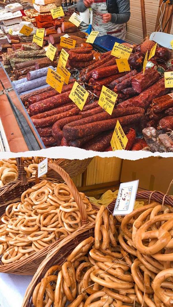 Jedzenie: minipączki, churrosy, obwarzanki, frytki, pajda chleba, pierogi, grzane wino, gorąca czekolada, kawa i herbata, bułka ze śledziem, tosty, kołacze.