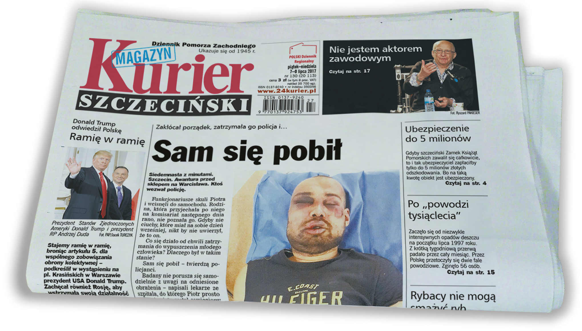 7 lipca 2017 r. w artykule pt. „Sam się pobił” opisaliśmy przypadek Piotra, którego w lipcu 2016 r. po awanturze przed sklepem przy ul. Warcisława w Szczecinie funkcjonariusze skuli i wcisnęli do radiowozu. Zawieziono go do izby wytrzeźwień, gdzie – wg jego relacji – został skatowany przez funkcjonariuszy. Stamtąd trafił do szpitala, potem znów na izbę, a następnego dnia na komisariat, skąd przyszła go odebrać rodzina. Nie mógł wówczas sam ustać na nogach, był w takim stanie, że z wyglądu w ogóle nie przypominał siebie. Prosto z komisariatu rodzina zawiozła go do szpitala. Trudno było znaleźć miejsca na ciele, które pozostały nietknięte, zwracały uwagę liczne ślady paralizatora. W szpitalu był dializowany, miał uszkodzone nerki. Przez dwa tygodnie poruszał się na wózku inwalidzkim, trzy miesiące dochodził do siebie, by odzyskać sprawność. Gdyby nie szybka pomoc rodziny i lekarzy, prawdopodobnie by nie przeżył.