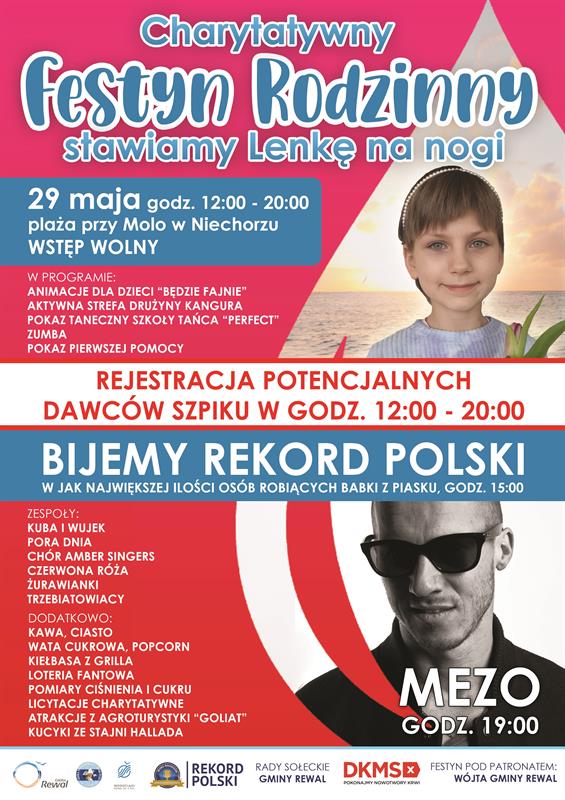 W niedzielę o g. 12 na molo w Niechorzu rozpocznie się 8-godzinny festyn rodzinny, na którym odbędzie się rejestracja potencjalnych dawców szpiku kostnego dla 9-letniej Lenki, mieszkanki pobliskiego Lędzina. Impreza połączona będzie z występami zespołów tanecznych, ludowych, animacjami dla dzieci, pokazami udzielania pierwszej pomocy pomiarami ciśnienia i mierzenia poziomu cukru we krwi. O godz. 15 zacznie się konkurs na „wypieczenie” maksymalnej ilości babek z piasku.