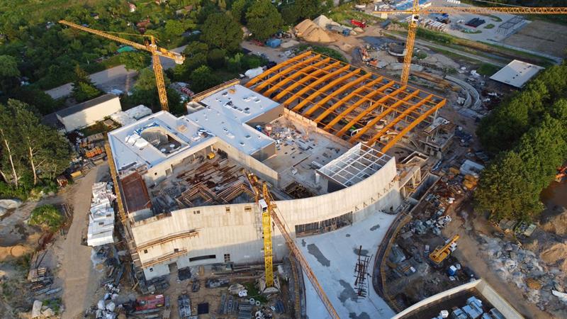 Wykonawca Fabryki Wody, która powstaje w miejscu kąpieliska Gontynka w Szczecinie, zbliża się do osiągnięcia docelowego kształtu budynku aquaparku. Drewniana konstrukcja dachu jest już prawie gotowa. Prace mają się zakończyć w 2022 roku.