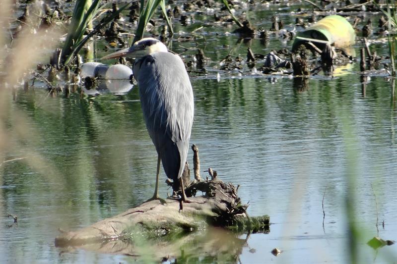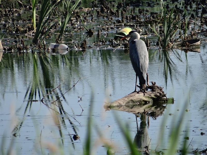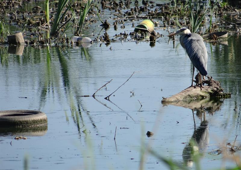Stara opona, wyrwany kosz na śmieci, baniak po chemikaliach i sporo butelek PET. W tych niepięknych okolicznościach przyrody stoi czapla siwa. Taki obrazek można dostrzec w tej niewielkiej części Jeziorka Słonecznego (Szczecin Gumieńce), jakiej jeszcze nie pokryło trzcinowisko.