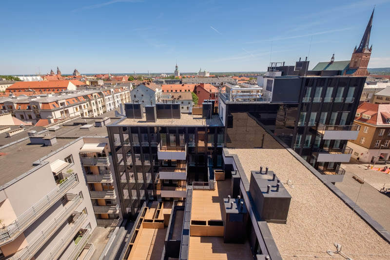 Łącznie w nowym apartamentowcu powstało 68 mieszkań o powierzchni od 28 do 156 mkw. W jednym z największych mieszkań, na ósmym piętrze pod nr 37 odbył się wczoraj uroczysty bankiet, na którym świętowano zakończenie prac budowlanych. Apartament ma 40-metrowy taras z widokiem na zachodnią część miasta - widać więc budowany właśnie „Posejdon", dwa kościoły przy pl. Zwycięstwa, Pocztę, pałac Akademii Sztuki i Kaskadę.