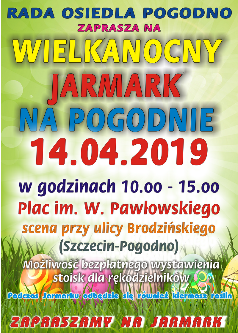 Na niedzielę (14 kwietnia) zaplanowano również Świąteczny Jarmark Rękodzieła na Pogodnie, którego organizatorem jest miejscowa rada osiedla. Impreza odbędzie się na skwerze Waleriana Pawłowskiego przy ul. Brodzińskiego w godz. 10-15. Dla wszystkich chętnych – twórców – możliwość wystawiania swoich produktów będzie bezpłatna. Uwaga: jarmarkowi będzie towarzyszyła minigiełda roślin.