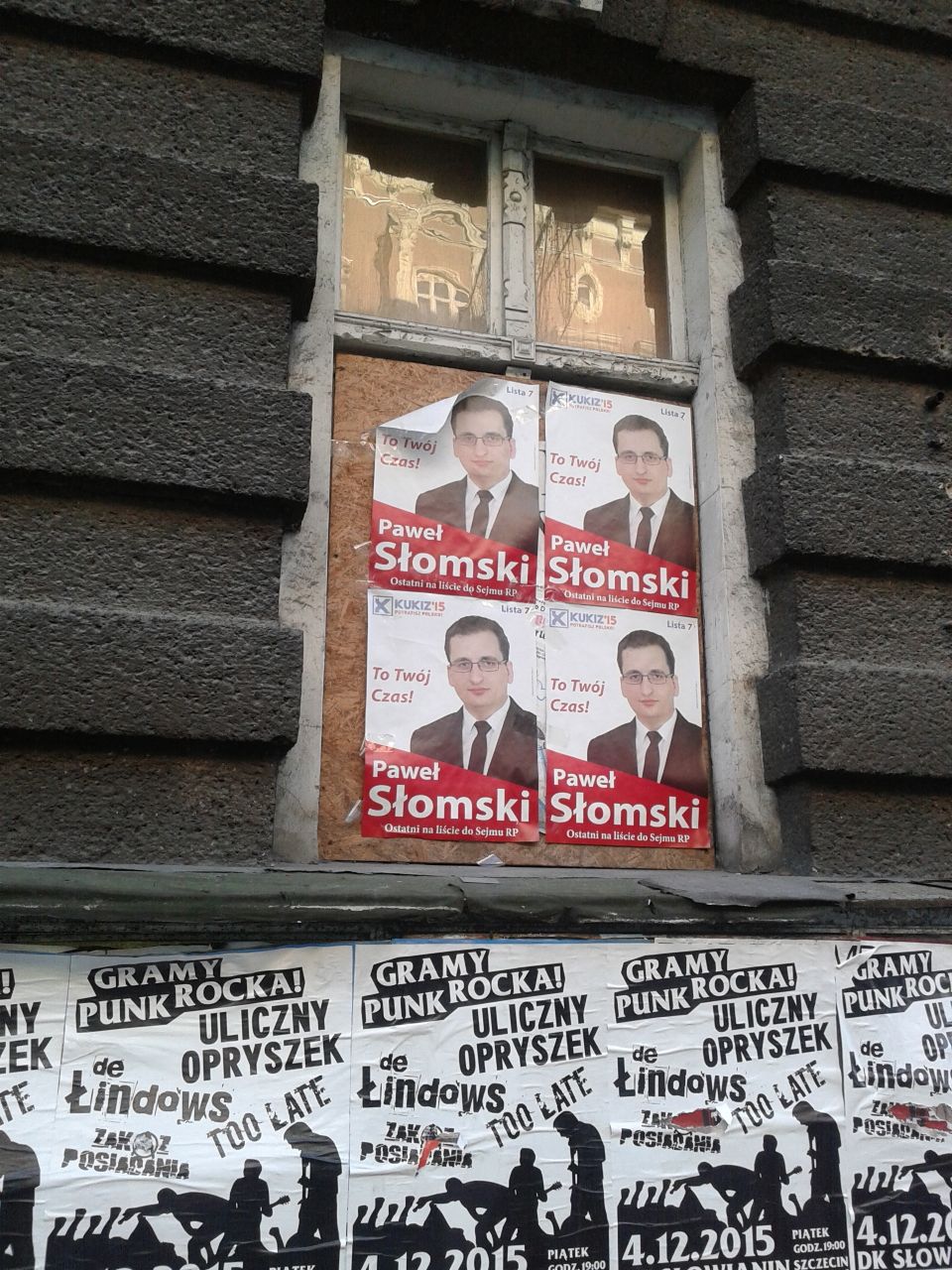 Choć Paweł Słomski, kandydat na posła z ramienia Kukiz'15 wywieszał swoje plakaty głównie na obitych tekturą oknach szczecińskich pustostanów, obowiązku uprzątnięcia ich w terminie dopełnić zapomniał. Ustawa daje na to miesiąc od dnia wyborów, czas zatem minął 25 listopada. Zdjęcie zrobiliśmy 3 stycznia, na ulicy Jagiellońskiej. Słomski startował do Sejmu z hasłem „To Twój czas" i obiecywał polepszenie skuteczności prawnych mechanizmów państwa. Najwyraźniej sam do własnych kampanijnych obietnic, niedoszły poseł stosować się nie zamierza.©℗