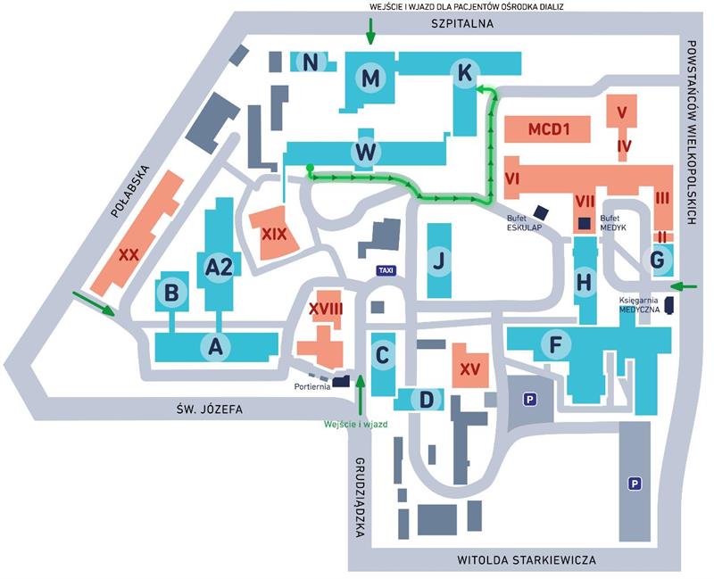Trasa do bud. K została pokazana na mapce. Można do niego wjechać także po podjeździe dla wózków (za ceglanym murkiem). Z holu trzeba się kierować na lewo. Wejście do izby zostało oznakowane.