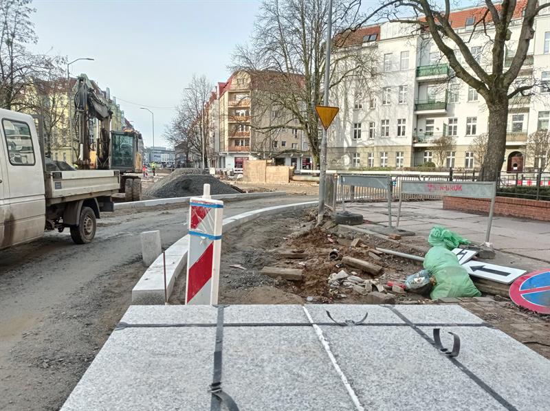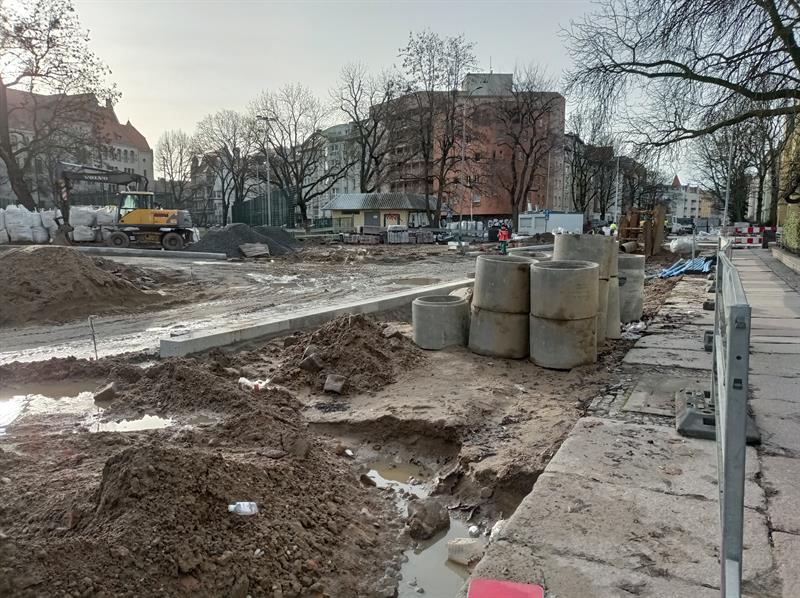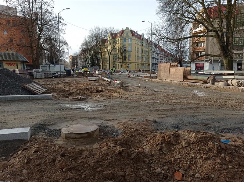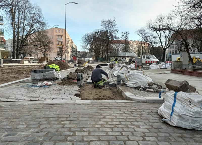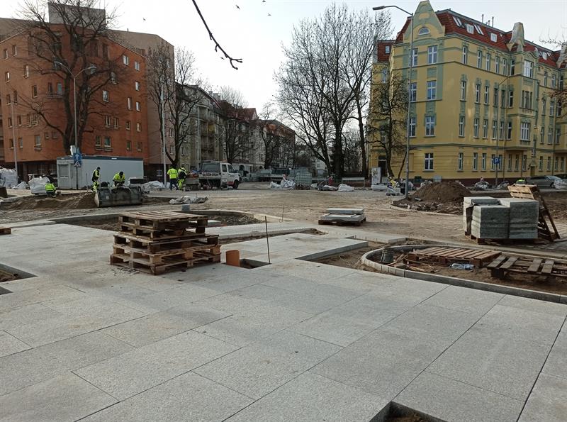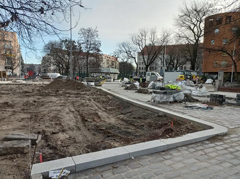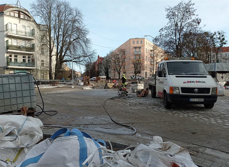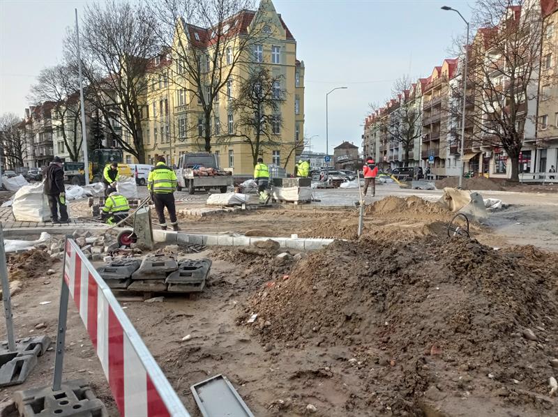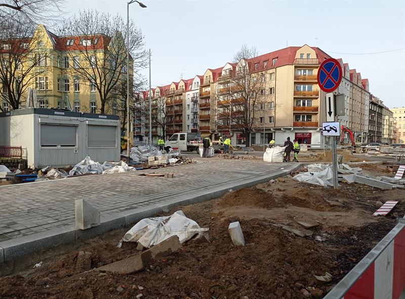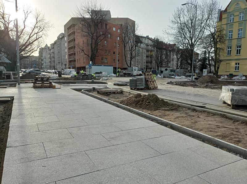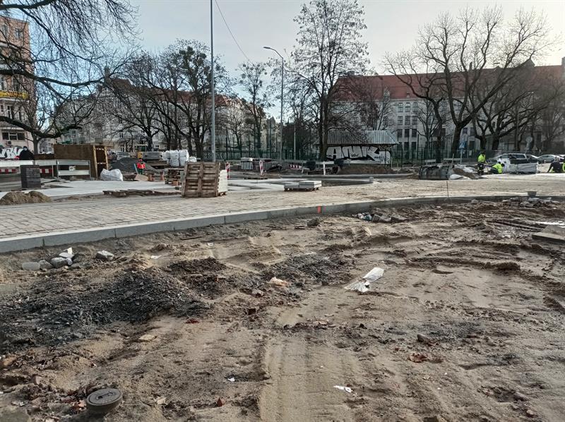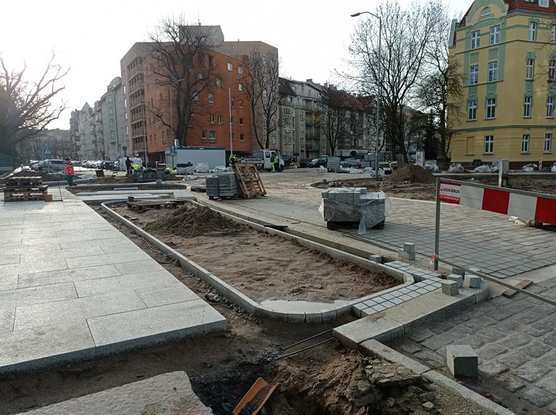Wykonawca planuje rozpoczęcie tam robót rozbiórkowych. Następnie prowadzone będą prace związane z ułożeniem wodociągu oraz wpustów deszczowych. Jednocześnie kontynuowane będzie brukowanie ronda. Do ukończenia są wciąż prace w obrębie samego ronda i pasach chodników znacznie poszerzonych w stosunku do poprzedniego układu kosztem zwężenia pasów jezdni na dojazdach na styku z pozostałymi ulicami z nowymi wyniesieniami spowalniającymi ruch w obrębie przejść dla pieszych. Tam wciąż trwa układanie nawierzchni z kostki brukowej i płyt chodnikowych.