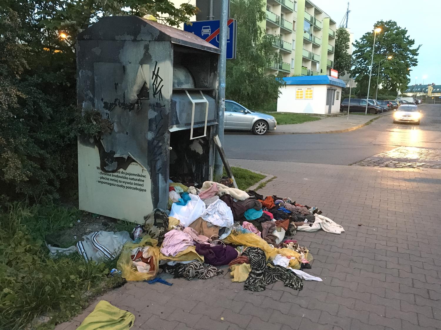 Ktoś jest właścicielem tego pojemnika na zużyte ciuchy, ktoś inny administratorem chodnika, na którym się one walają. Jest jeszcze odpowiedzialna za porządek straż miejska. Ale jak widać, u zbiegu ulic Łabędziej i Sportowej na Niebuszewie, nikogo to nie rusza. Tak jak nie rusza na wpół spalony pojemnik.