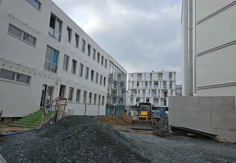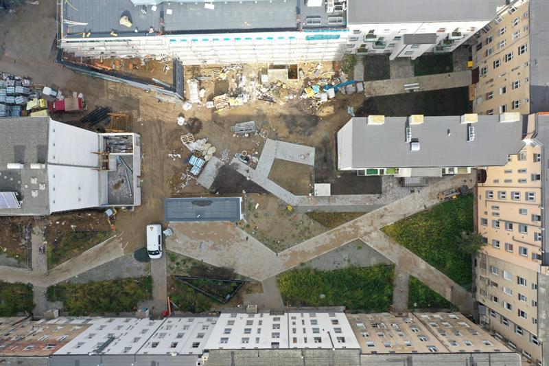 Na terenie wnętrza kwartału prowadzone również były prace związane z zagospodarowaniem terenu. Wykonywano podbudowy oraz nawierzchnie na chodnikach z płyt betonowych, a także opaski żwirowe wokół budynków.