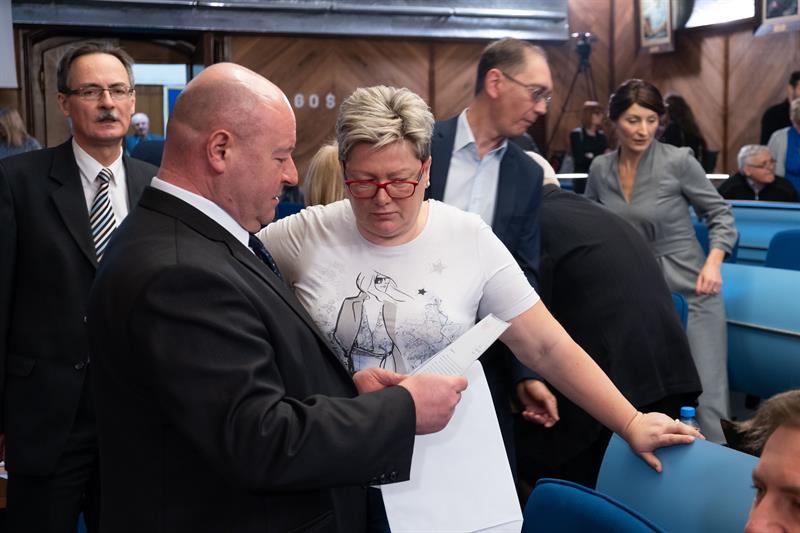 Na zdjęciu: Agnieszka Drewnowska z grupy protestujących przeciw przeniesieniu CEO i radny Władysław Dzikowski na wtorkowej sesji Rady Miasta