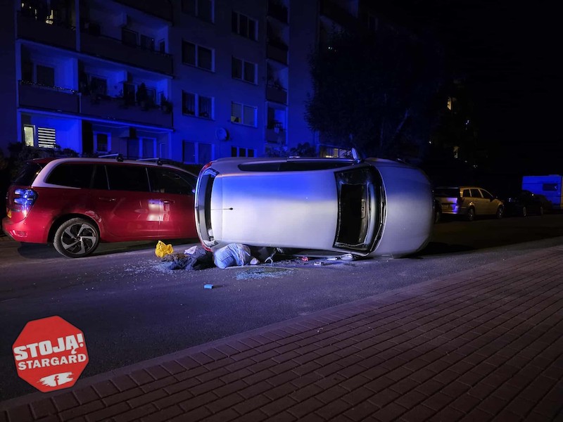 Jak informuje policja, kierowca volkswagena uderzył w 4 zaparkowane pojazdy, a następnie dachował.