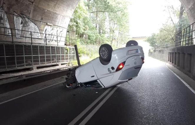 Kłopoty z przejazdem przez ul. Szczawiową w Szczecinie. Pod wiaduktem dachował tam osobowy opel.