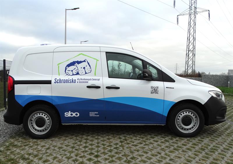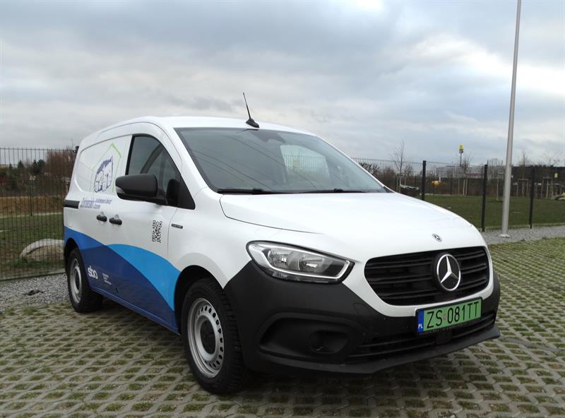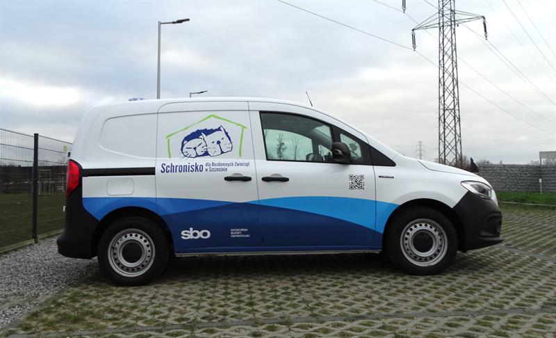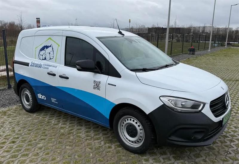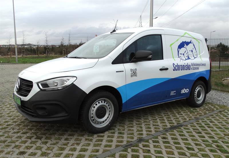 To dostarczony przez dealera z Poznania nowy Mercedes: z automatyczną skrzynią biegów, kamerą cofania, silnikiem 90 kW, na jednym ładowaniu – w cyklu miejskim – o zasięgu przynajmniej 250 km. Dodatkowo wyposażony w jednym ze szczecińskich renomowanych warsztatów samochodowych, czyli dostosowany do komfortowego przewozu czworonogów: z dwiema klatkami transportowymi w przestrzeni bagażowej, uchwytami i półkami na smycze, pasy i inny sprzęt służący zabezpieczeniu przewożonych zwierząt, z wentylatorem dachowym oraz dodatkowym oknem pomiędzy kabiną a strefą bagażową.