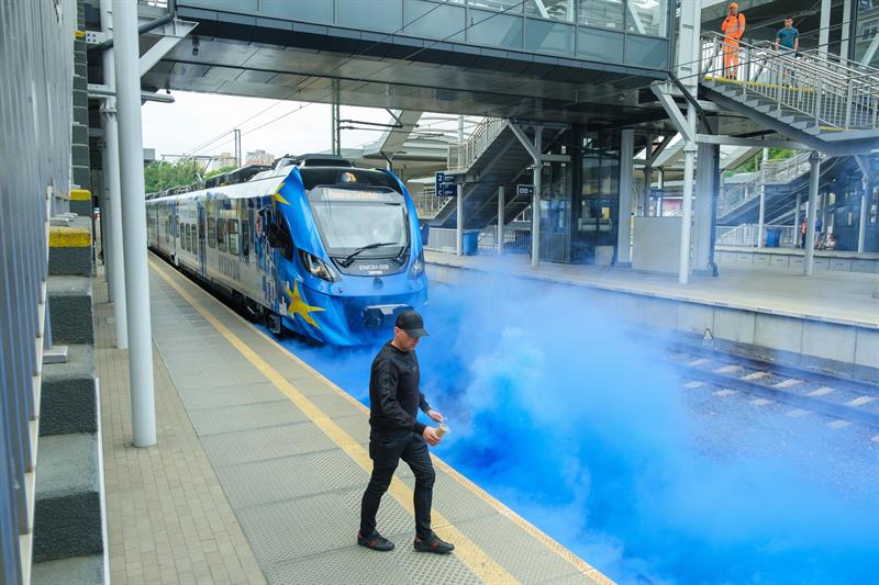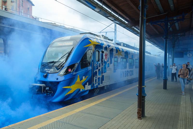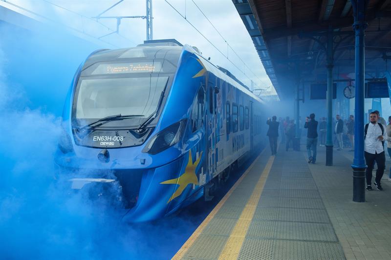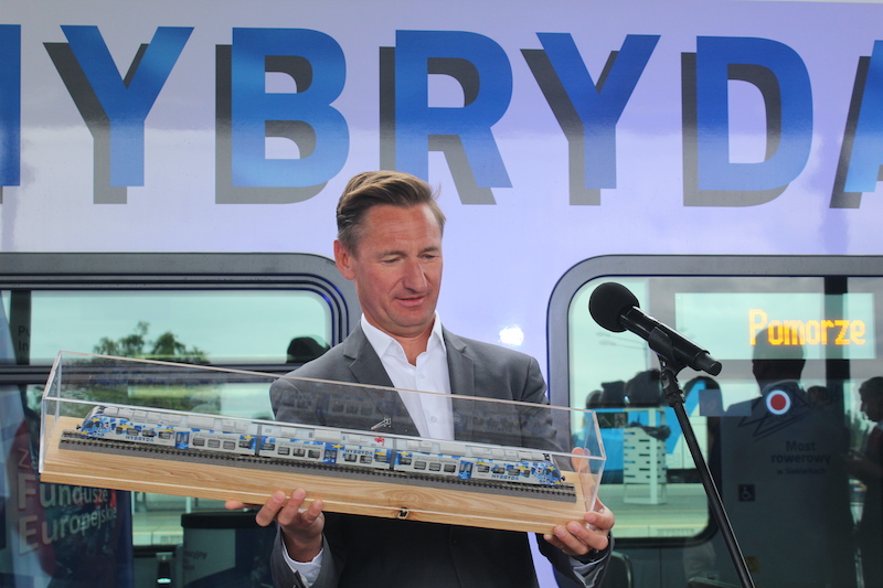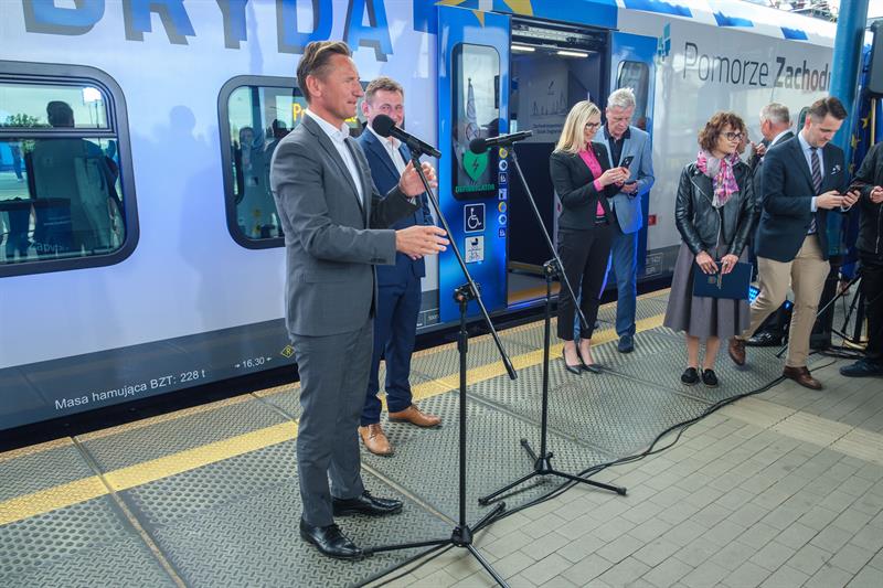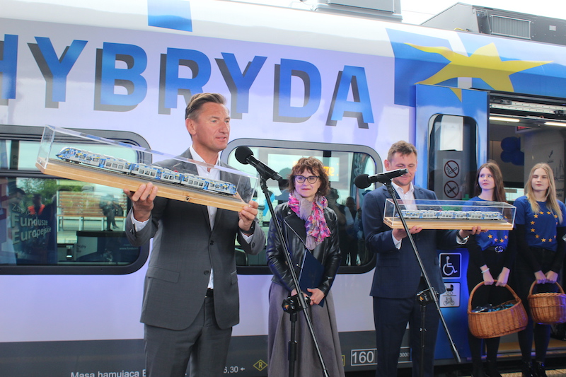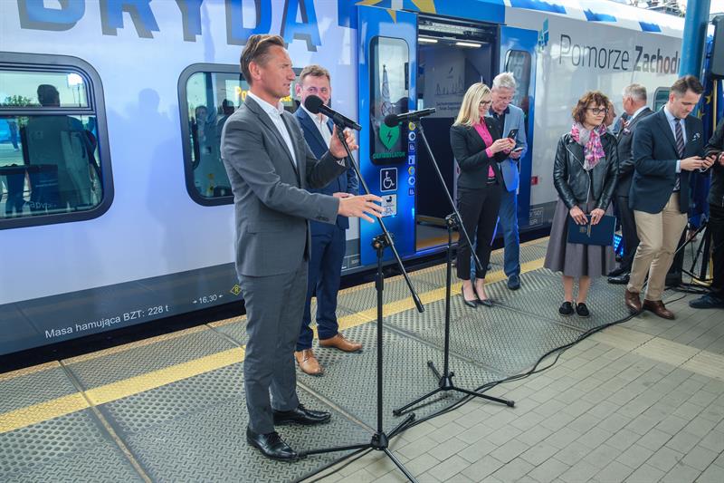 - Mamy złoty pociąg, mamy pociąg w barwach Pogoni Szczecin i "Moniuszko". Jest hybryda "Bursztynowa", ' Ekologiczna", tym razem zdecydowaliśmy się na nawiązanie do Unii Europejskiej - tłumaczy marszałek Olgierd Geblewicz. - Jesteśmy dumni z tego, że jesteśmy w Unii. Bez Unii nie byłoby wielu zmian na lepsze, nie byłoby dofinansowania na te nowoczesne pociągi.