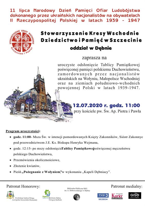 Na niezwykłą uroczystość zaprasza na niedzielę (12 lipca) do Dębna Stowarzyszenie Kresy Wschodnie Dziedzictwo i Pamięć. Po uroczystej mszy św., zaplanowanej na godz. 11, przy kościele Świętych Piotra i Pawła odsłonięta zostanie pamiątkowa tablica.