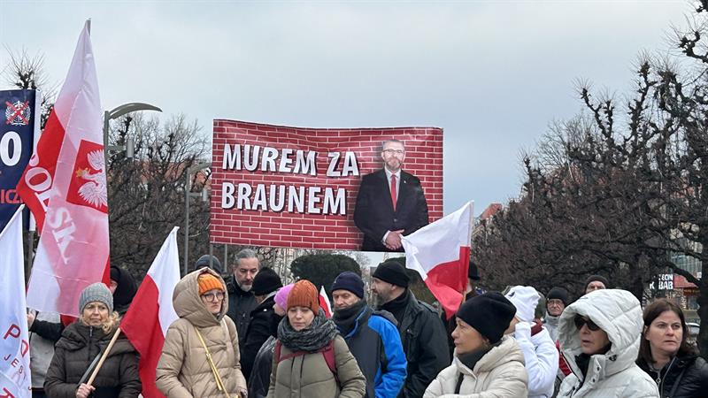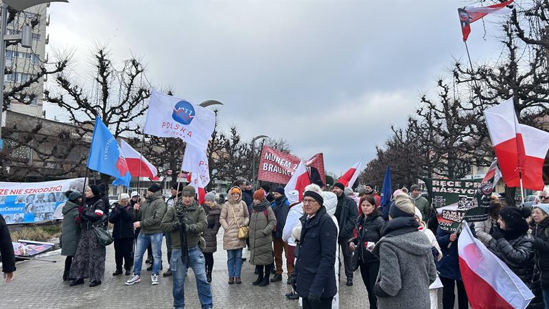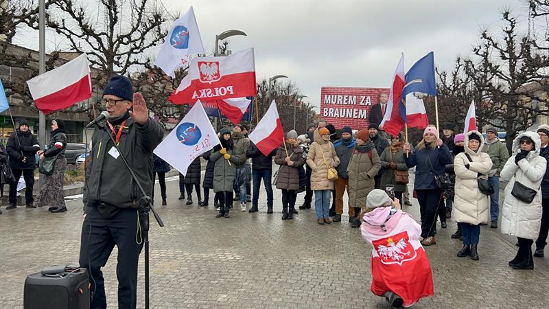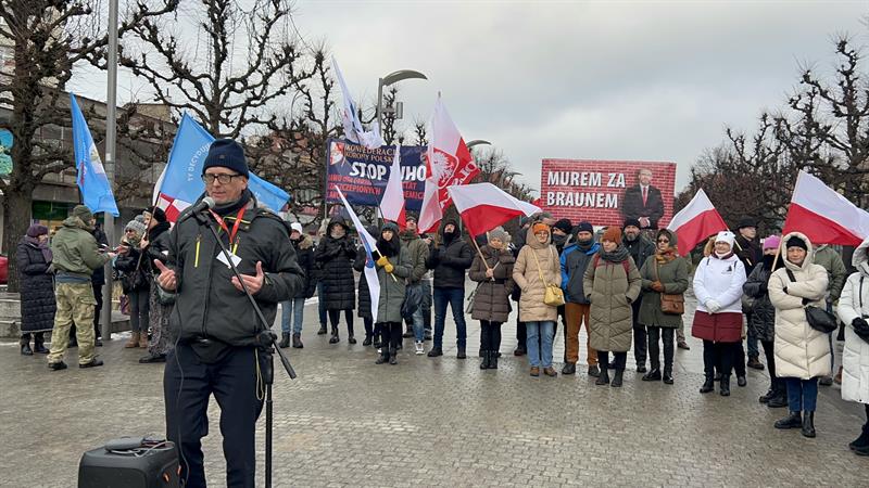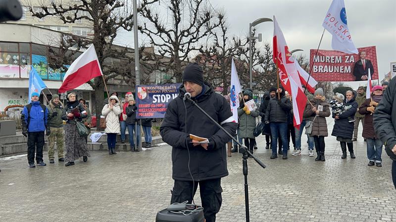 – Zostali okrutnie zaatakowani przez polski rząd. Ten rząd przez funkcjonariuszy ABW wtargnął do 40 prywatnych domów. M.in. zabrali komputery informatykom, zabrali prawnikowi... Co to jest?! Prześladuje się lekarzy, niezależnych naukowców ze stowarzyszenia „Po pierwsze nie szkodzić” – mówił. — Robiliśmy protesty przeciwko przymusom tzw. szczepień, przeciwko fanaberiom naukowym, które nam wciskano. Teraz Donald Tusk mówi, że antyszczepionkowcy są na usługach rosyjskich służb. To jest kłamstwo! Zaprzeczam! U nas żadnych agentów nie ma i nie było! Jesteśmy Polakami, pracujemy tylko dla Polski. Mamy tu baner „Murem za Braunem”. Ten człowiek walczy, walczy o niepodległość, o wolność Polski.
