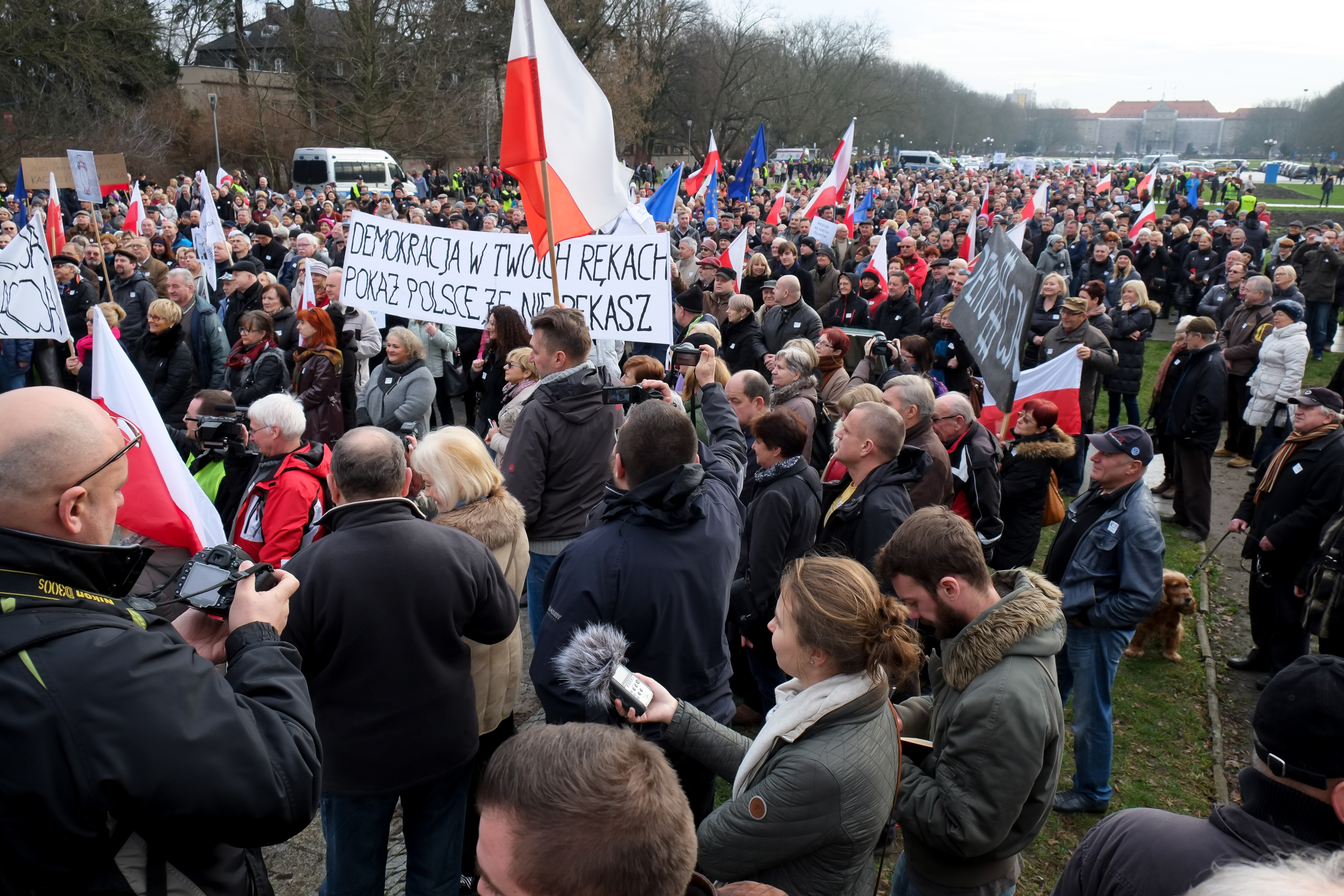 W sobotę na pikietę Komitetu Obrony Demokracji przyszło pod Pomnik Czynu Polaków w Szczecinie ponad 2,5 tys. osób - tak szacują policjanci pilnujący porządku na Jasnych Błoniach i organizatorzy demonstracji. Przyszli nie tylko szczecinianie. Bronić demokracji przyjechały całe rodziny z Goleniowa, Stargardu Szczecińskiego, Barlinka, Gryfina... Przynieśli biało-czerwone i unijne flagi. I transparenty z hasłami np.: „Państwo prawa - nie Jarosława" albo „Polacy nie chcą prezesa".