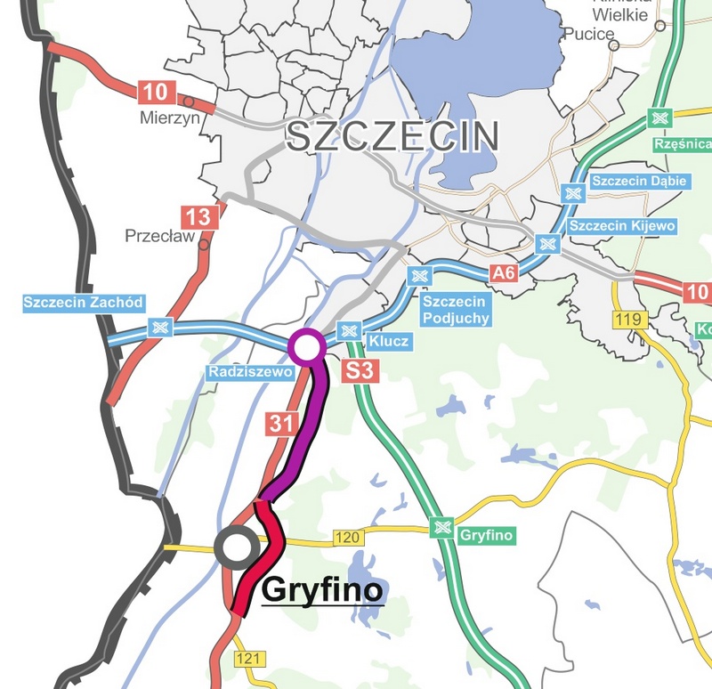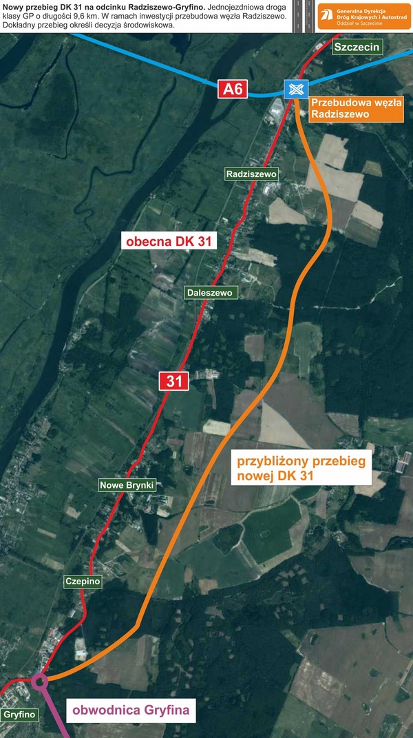 Natomiast dla odcinka DK31 Radziszewo-Gryfino o długości 9,6 km zostanie opracowane studium techniczno-ekonomiczno-środowiskowe wraz z elementami koncepcji programowej i badaniami geologicznymi. Podczas prac przygotowawczych zostanie również uzyskana decyzja środowiskowa, która określi przebieg inwestycji. Nowa droga ominie wiele miejscowości znajdujących się na obecnej DK31 między Szczecinem a Gryfinem, wyprowadzając z nich ruch tranzytowy. Będzie to jednojezdniowa drogą klasy GP o przekroju 1x2. Odcinek będzie się rozpoczynał od węzła Radziszewo, a kończył na włączeniu w obwodnicę Gryfina. W ramach inwestycji przewidziana jest również przebudowa węzła drogowego Radziszewo tak, aby spełniał współczesne wymagania.