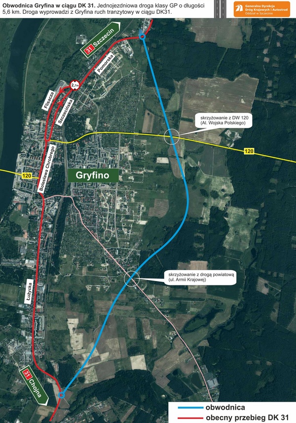 Dla obwodnicy Gryfina w ciągu DK31 o długości 5,6 km zostanie opracowana koncepcja programowa wraz z badaniami geologicznymi. Dokumentacja ta uszczegółowi rozwiązania projektowe w korytarzu określonym w decyzji środowiskowej z 2012 roku. Obwodnica wyprowadzi z Gryfina przebiegający w centrum miasta ruch tranzytowy w ciągu DK31, znacząco zmniejszając jego oddziaływania. Nowa trasa ominie też wiadukt kolejowy na wjeździe do Gryfina od strony Szczecina o ograniczonej skrajni poziomej, przez który samochody ciężarowe i autobusy jadące DK31 muszą obecnie skręcać na drogę powiatową. Obwodnica ominie miasto od wschodu, będzie to jednojezdniowa droga klasy GP (droga główna ruchu przyspieszonego).