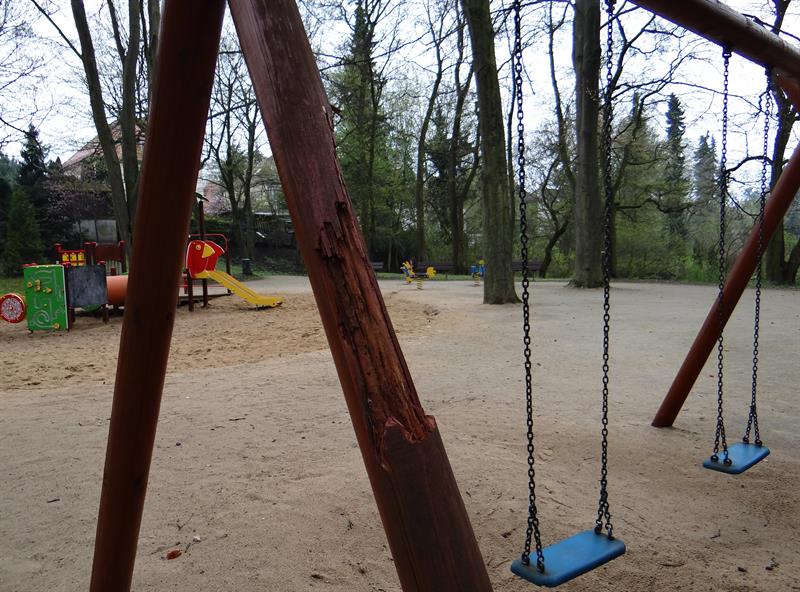 Z daleka wygląda świetnie: nowocześnie i kolorowo. Jednak z bliska… Brak paru nitów, wystające śrubki, a przede wszystkim nadszarpnięte - raczej nie zębem czasu - rusztowanie huśtawki wskazują, że także urządzeniom zabawowym na Różance przydałby się pilny przegląd techniczny. I wiosenne porządki na piasku.