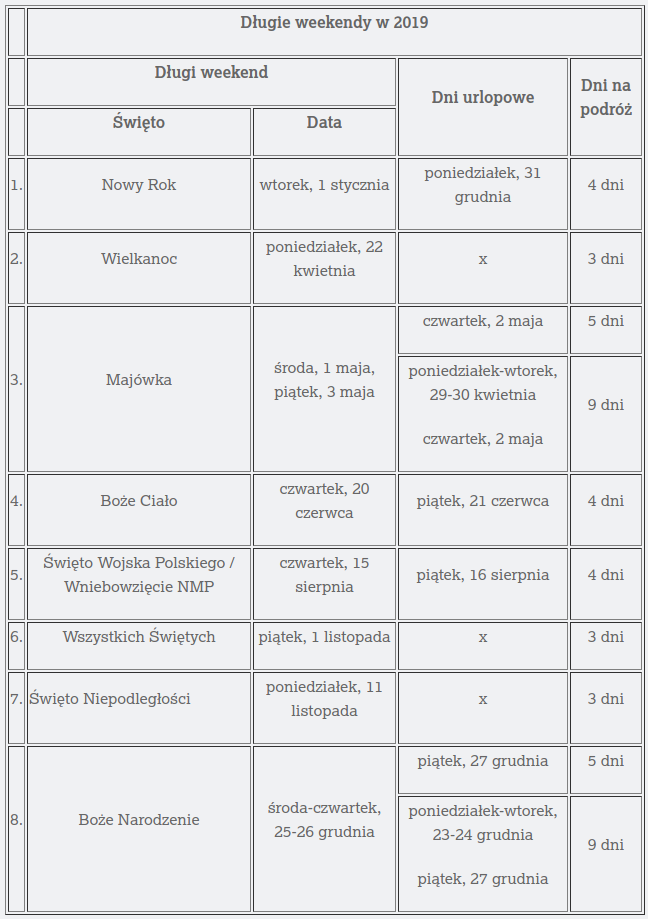 Nadchodzący rok będzie naprawdę korzystny dla tych, którzy lubią skorzystać z dodatkowego dnia wolnego, aby wybrać się np. na krótki wypad za miasto. W 2019 roku czeka na nich bowiem 8 długich weekendów dzięki korzystnie wypadającym dniom wolnym od pracy. Część z nich nie będzie wymagać nawet drobnego naruszenia puli urlopowej, ponieważ święta wypadają w poniedziałek bądź piątek. To właśnie przypadek Wszystkich Świętych (piątek, 1 listopada) oraz Święta Niepodległości (poniedziałek, 11 listopada). Dla zapalonych podróżników dobrą okazją będą też wypady planowane wokół świąt wypadających w czwartek, które dadzą cztery dni na podróż, zabierając zaledwie jeden dzień urlopu. Jak co roku jest wśród nich Boże Ciało, w tym roku świętowane 20 czerwca, dzięki czemu można liczyć na ładną pogodę, idealną na podróż.