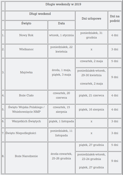 Kolejnym świętem, które warto mieć w pamięci jest czwartek 15 sierpnia, czyli święto Matki Boskiej Zielnej oraz Wojska Polskiego. Nie nadszarpując zbytnio urlopu można cieszyć się dłuższą przerwą także w okresie bożonarodzeniowym, ponieważ Święta wypadają w środę i czwartek. Zaraz po nich – Nowy Rok obchodzony we wtorek (ergo: tylko poniedziałek dzieli od czterodniowego pożegnania starego roku). Jednak to najprawdopodobniej majówka będzie hitem wśród podróżnych (środa, 1 maja oraz piątek, 3 maja) – zaledwie jeden dzień dzieli od pięciu dni na podróż, a trzy – od 9-dniowego wyjazdu.