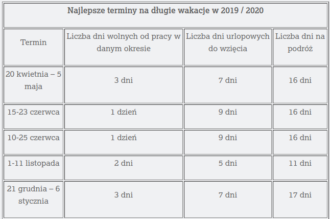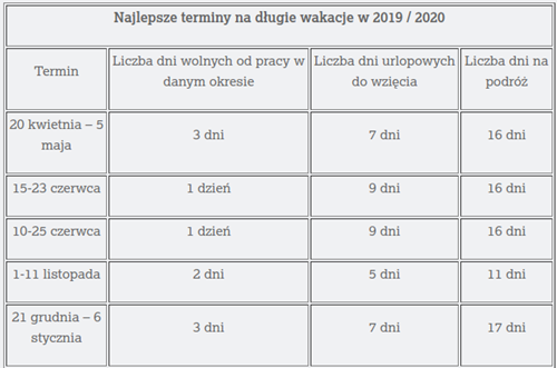Podróżni, którzy wolą wakacje poza szczytem sezonu, powinni rozważyć pierwsze dni listopada – wyjeżdżając w okresie 1-11 listopada wystarczy wziąć 5 dni z przysługującego urlopu, aby cieszyć się jedenastoma dniami wolnego. Dobrym terminem na długie wakacje będzie też okres bożonarodzeniowy i noworoczny. Podczas gdy wielu Polaków ceni tradycje i czas spędzony w gronie najbliższych, część woli jednak uciec przed świąteczną gorączką i kilka dodatkowych dni wolnych zmienić w daleką podróż. W 2019 roku będą mogli cieszyć się 17 dniami podróży w okresie między 21 grudnia a 6 stycznia. Tym samym 5 dni wolnego z 2019 i 2 z puli na 2020 zmieni się w ponad dwutygodniowe wakacje.