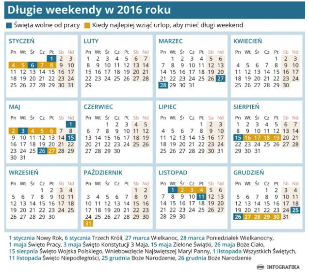 W kolorze niebieskim zaznaczono święta wolne od pracy, natomiast na pomarańczowo dni w których najlepiej wziąć urlop, aby mieć długi weekend. Wybór w 2016 roku należy do Ciebie, drogi Internauto.