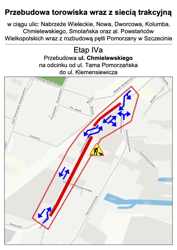 Ruch pojazdów ul. Zygmunta Chmielewskiego będzie utrzymany w obu kierunkach z tym, że od skrzyżowania z ul. Tama Pomorzańska do adresu przy ul. Zygmunta Chmielewskiego 24 (na wysokości nowego wieżowca i przy garażowisku po przeciwnej stronie) tą stroną jezdni, która zwykle prowadzi do ul. Krzysztofa Kolumba i i tą dalej do dworca. Natomiast na dalszym odcinku aż do zablokowanego w całości skrzyżowania będącego w przebudowie w obu kierunkach przejazd wytyczony został stroną, którą na co dzień kierowcy pokonują, by dojechać m.in. do browaru, pobliskiej drukarni Zapolu i dalej w okolice Zespołu Szkół Rzemieślniczych oraz do ul. Zenona Klemensiewicza. Od piątku nie będzie działać również sygnalizacja świetlna przy przejściu dla pieszych na wysokości wjazdu do browaru „Bosman”. ©℗