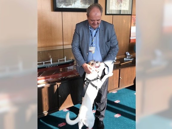 Paweł Brzezicki, zarządca komisaryczny PŻM, przyszedł do pracy ze swoim psem Kajtkiem.