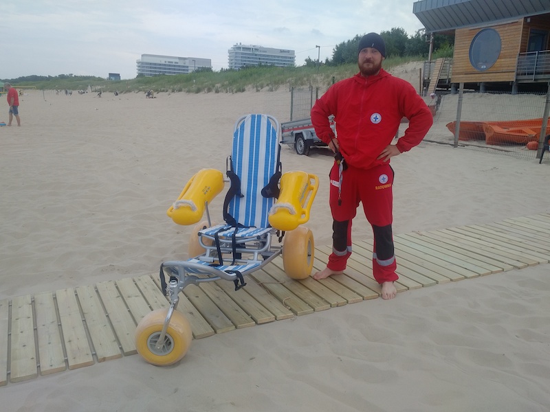 Na zdjęciu: W Świnoujściu zakupiono specjalistyczny wózek do morskich kąpieli, z którego będą mogły skorzystać osoby z niepełnosprawnościami.