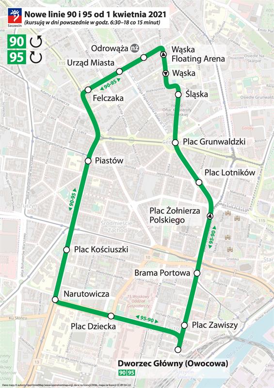 Pojadą w jednokierunkowej relacji Dworzec Główny (Owocowa) - Narutowicza - Urząd Miasta - Dworzec Główny (Owocowa). Trasa linii będzie przebiegać ul. Narutowicza - al. Piastów - al. Wojska Polskiego - ul. Felczaka - ul. Wąską - ul. Wielkopolską - ul. Śląską - al. Papieża Jana Pawła II - ul. Kaszubską - ul. Bałuki - al. Niepodległości - ul. 3 Maja. Wyznaczone dla nich przystanki to: Dworzec Główny (Owocowa) (nr 22912) – ten sam, co dla linii 90; Plac Dziecka (nr 18531) – nowy przystanek przy ul. Narutowicza przed skrzyżowaniem z ul. Kopernika na miejscu parkingowym przy boisku Orlik; Narutowicza (nr 21014) – istniejący przystanek dla linii 61, 62, 81, 83, 523 i 524; Plac Kościuszki (nr 10433) – istniejący przystanek dla linii 81, 83, 523 i 524; Piastów (nr 11831) – istniejący przystanek dla linii 523 i 524; Felczaka (nr 12322) – istniejący przystanek dla linii 87; Urząd Miasta (nr 12521) – istniejący przystanek dla linii 87; Odrowąża nż (nr 18412) – istniejący przystanek dla linii 87; Wąska (nr 18611) – nowy przystanek przy ul. Wąskiej za skrzyżowaniem z ul. Niedziałkowskiego; Śląska (nr 18722) – nowy przystanek przy ul. Śląskiej za skrzyżowaniem z ul. Wielkopolską; Plac Grunwaldzki (nr 11631) – istniejący przystanek dla linii 523, 524 i 531; Plac Lotników (nr 17851) – istniejący przystanek dla linii 86; Brama Portowa (nr 10833) – istniejący przystanek dla linii 61 i 87 w al. Niepodległości za skrzyżowaniem z ul. Wyszyńskiego (przy nowym Posejdonie); Plac Zawiszy (nr 22811) – istniejący przystanek dla linii 61, 87 i 529; Dworzec Główny (Owocowa) (nr 22912).