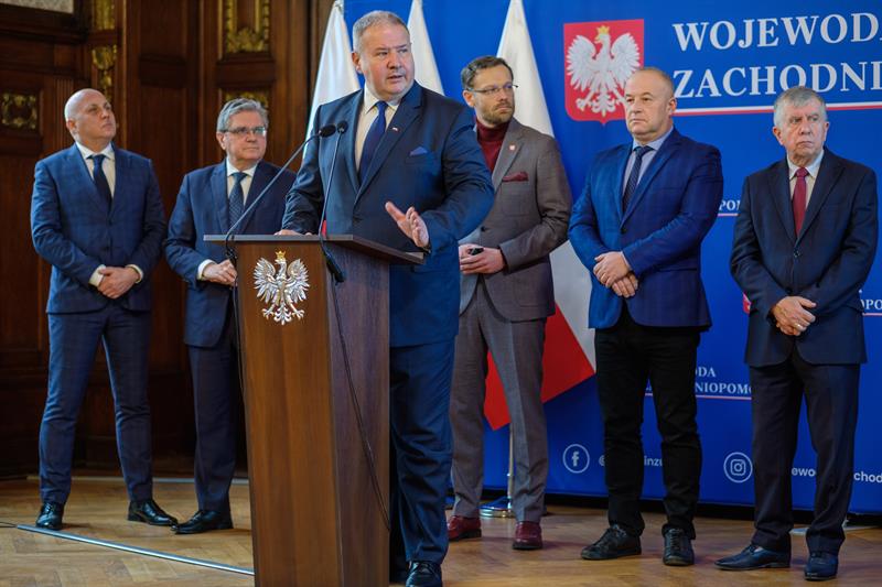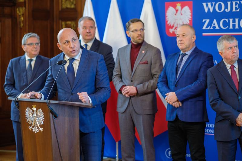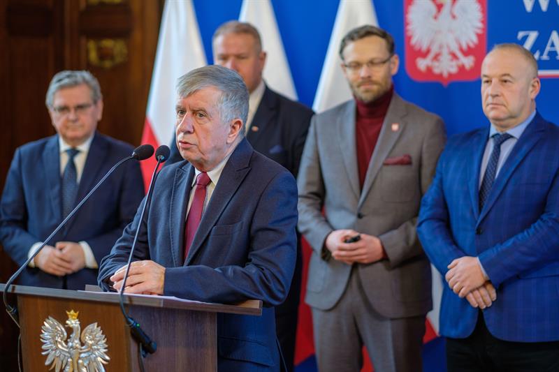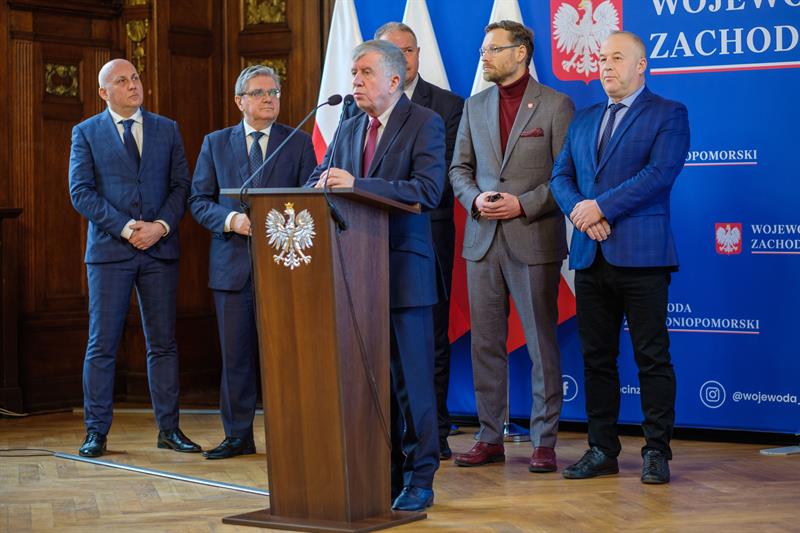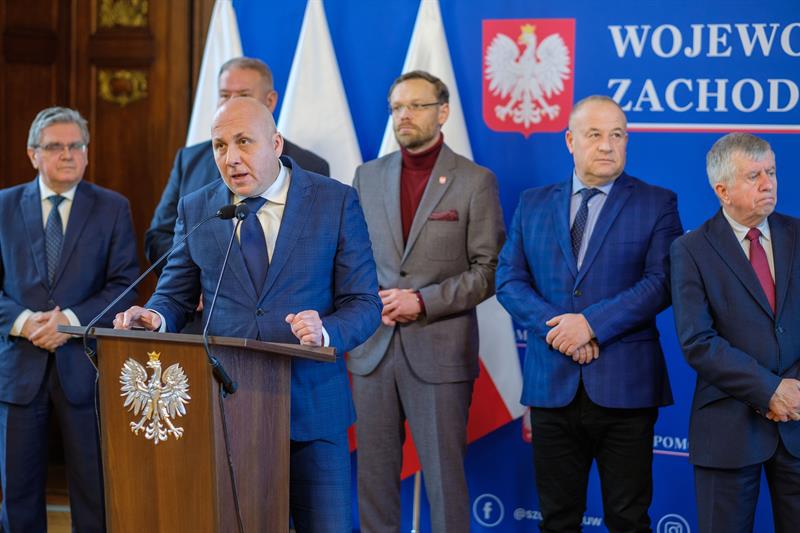 O dodatkowych środkach dla zachodniopomorskich szpitali na wtorkowej konferencji prasowej mówili: wojewoda zachodniopomorski Zbigniew Bogucki, dyrektor ZOW NFZ Paweł Kurzak, posłowie PiS - Leszek Dobrzyński, Czesław Hoc, Michał Jach, Artur Szałabawka. Fot. Dariusz Gorajski