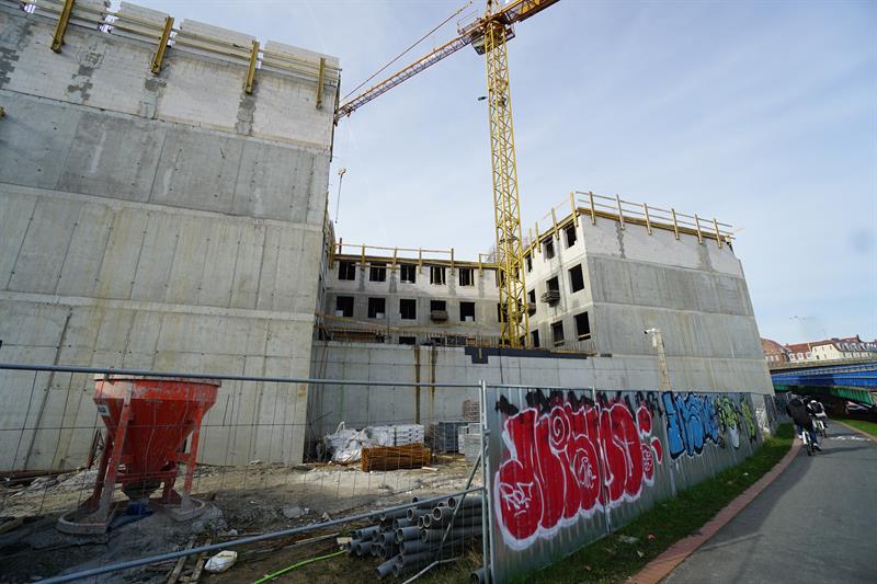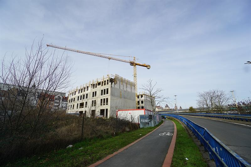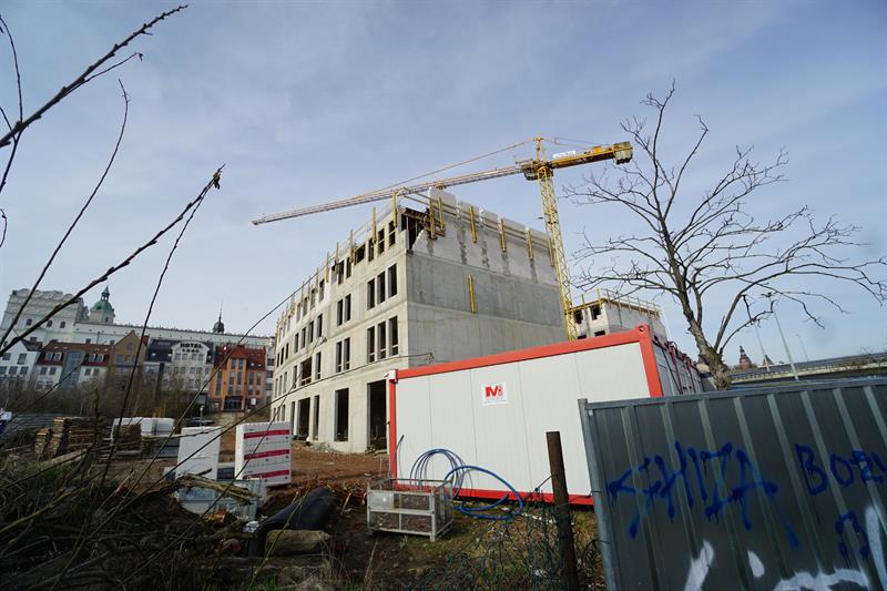 Do całkowitego zagospodarowania są tam działki w rejonie Rynku Warzywnego. Widoczny na naszych zdjęciach budynek położony jest na działce nr 6, gdzie zezwolono na zabudowę mieszkalno-usługową. Okazuje się, że inwestorzy celowo zostawiają ściany zwrócone do Odry w taki sposób, aby można było bezproblemowo dostawić do nich kolejne segmenty. W efekcie powstają budynki ze ścianami bez okien, które w innej sytuacji pełniłyby nie tylko funkcję izolacji akustycznej czy termicznej, ale również wpływałyby na ogólny kształt bryły budynku. Od jednego z inwestorów, którym jest spółka Pod Zamkiem 24, uzyskaliśmy informację, że planowane zakończenie prowadzonej przez nich inwestycji to wrzesień 2025 roku.