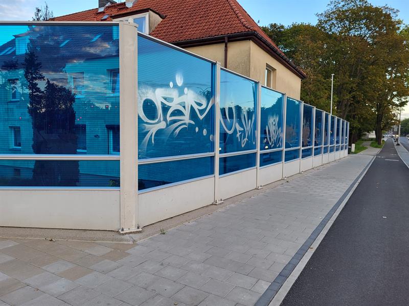 Zdewastowane zostały panele akustyczne oddzielające domy od ulicy. Na większość paneli przypada jeden tzw. tag (forma podpisu w subkulturze grafficiarzy). Nasz Czytelnik mówił, że próbował z mieszkanką okolicy usunąć napisy, jednak okazało się to zbyt trudne bez odpowiednich narzędzi i środków chemicznych.