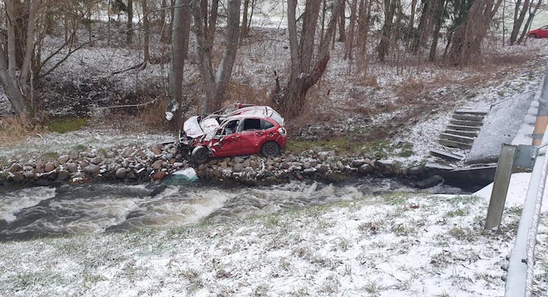 W nocy samochód osobowy wypadł z drogi w pobliżu mostu. Rozbite auto zatrzymało się kilkanaście metrów od jezdni nad brzegiem rzeki. W jego wnętrzu znajdowała się ranna kobieta, która nie była w stanie o własnych siłach opuścić pojazdu. Przejeżdżający drogą kierowcy nie widzieli go z powodu panujących ciemności. Wrak został zauważony dopiero rano - tuż przed godz. 8.