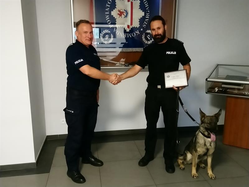 Na zdjęciu: Komendant powiatowy policji w Stargardzie insp. Robert Nowak pogratulował st. asp. Tomaszowi Betlerowi zwycięstwa w wojewódzkim etapie konkursu. Duży udział w sukcesie ma Dora, która musiała się wykazać posłuszeństwem, sprawnością i doskonałym węchem.