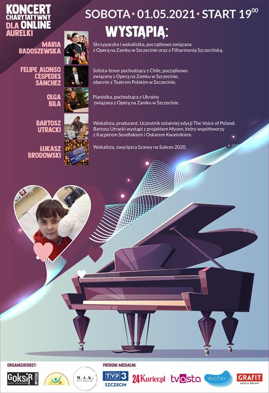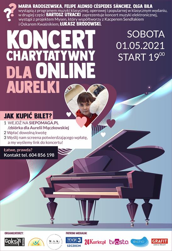 Już w tę sobotę, 1 maja, odbędzie się koncert online na rzecz Aurelii Mączkowskej z Mirosławca. Uczennica Szkoły Podstawowej w Kaliszu Pomorskim ma guza mózgu. Do 5 maja potrzebna jest kwota 1,7 mln zł na jej leczenie w USA.