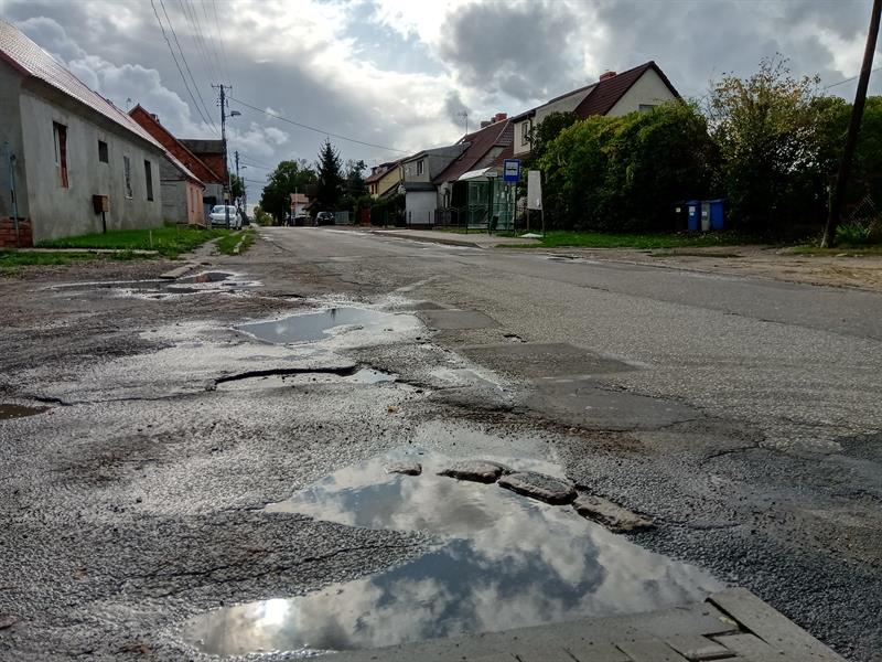 Droga w Ustowie jest w złym stanie: ma liczne spękania, ubytki, wyboje i zapadnięcia, brak ciągłości chodników oraz brak wymaganej szerokości zarówno jezdni jak i chodników. Fot. Tomasz Tokarzewski