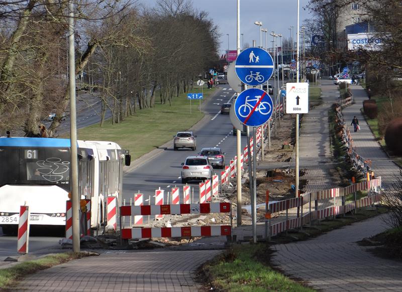 Ul. Mieszka I. Rozkopany na wysokości sklepu IKEA od października 2021 r. fragment pobocza z zagrodzonym pasem drogi rowerowej. Oto dotyczczasowe dzieło drogowców na zaanektowanym pod przebudowę odcinku ok. 350 m w stanie obecnym dalece wciąż niedokończonym. Fot.: Mirosław WINCONEK