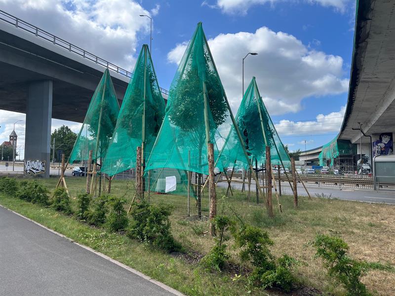 Drzewa, których gałęzie mogłyby ucierpieć podczas prac wysokościowych, zostały zabezpieczone siatkami ochronnymi. To proste, ale skuteczne rozwiązanie chroni roślinność przed przypadkowymi uszkodzeniami spowodowanymi przez sprzęt budowlany lub spadające materiały. Zabezpieczenia te to przykład odpowiedzialnego podejścia do inwestycji w przestrzeni miejskiej. Dzięki nim możliwe jest zachowanie cennych okazów drzew, które mają znaczenie nie tylko krajobrazowe, ale i ekologiczne – wpływają na jakość powietrza, obniżają temperaturę i tłumią hałas. Zieleni nie traktuje się tu jako przeszkody, lecz jako pełnoprawnego uczestnika miejskiej tkanki, zasługującego na należytą ochronę – nawet w trakcie dużych inwestycji infrastrukturalnych.
