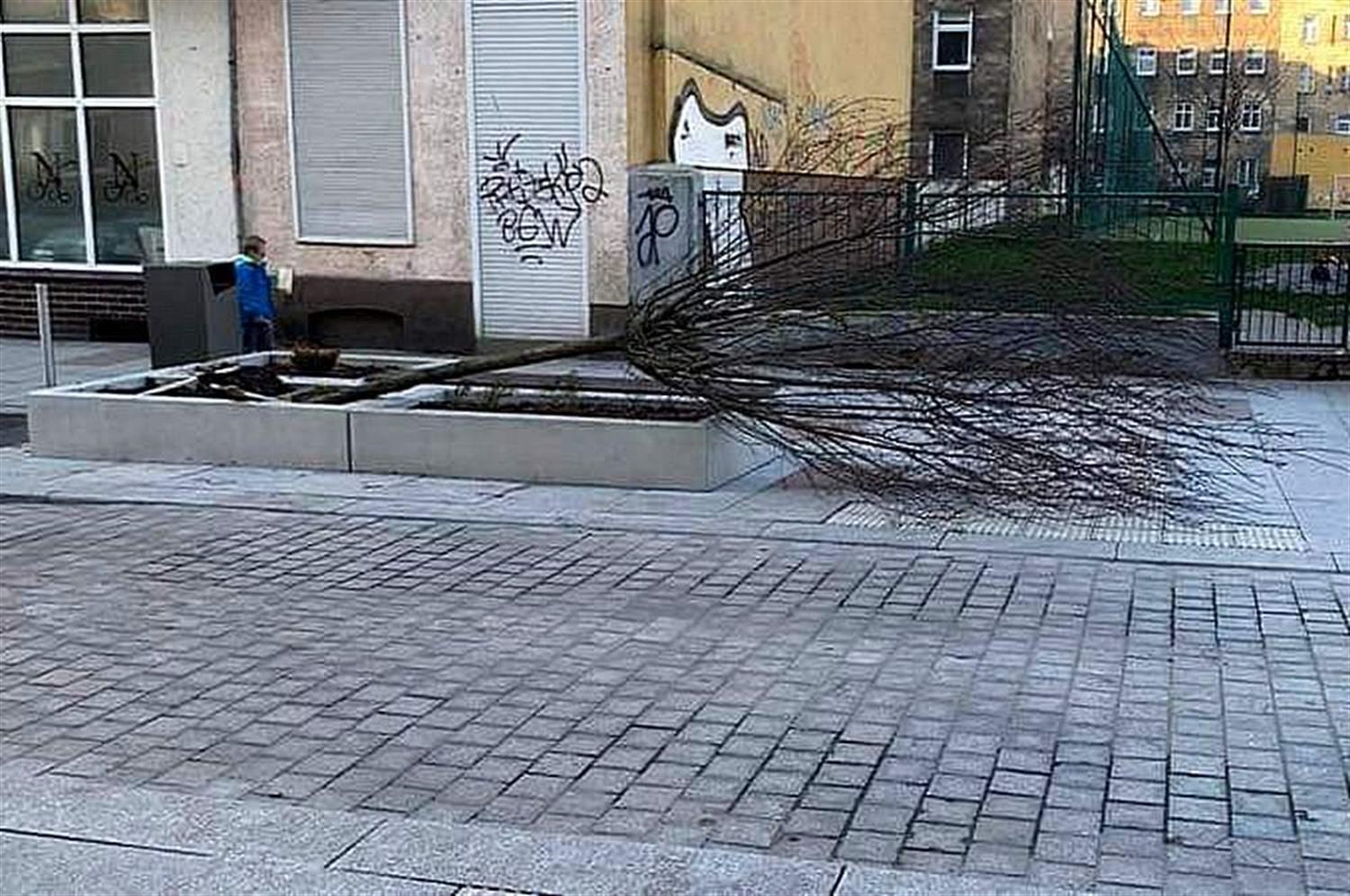 Porywisty wiatr dał się we znaki w ub. tygodniu - także w Szczecinie. Nie tylko zrywał poszycia dachów (np. ul. Asnyka), łamał konary parkowych i przyulicznych drzew, ale też - niespodziewanie - weryfikował jakość nasadzeń dokonanych przy okazji niedawno zakończonej przebudowy ul. Małkowskiego. Niemal wszystkie straciły stabilność. Gdy jednych pnie odchyliły się od pionu ledwie o centymetry, to inne o blisko metr. Jednak jedno z drzew podmuch powalił, wyrywając wraz z bryłą korzeniową z donicy betonowego kwietnika.