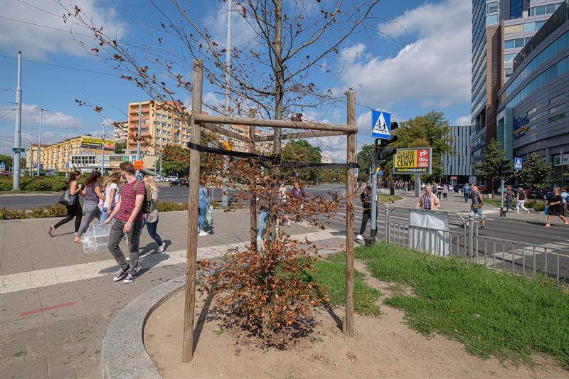 Niedawno posadzony, choć już wcale nie taki mały czerwonolistny buk rośnie przy przystanku tramwajowym na pl. Rodła w Szczecinie. Rośnie to zbyt wiele powiedziane. Raczej wegetuje. Usycha, choć, jak twierdzi nasza Czytelniczka, jest jeszcze do uratowania. Trzeba go jednak jak najszybciej podlać.
