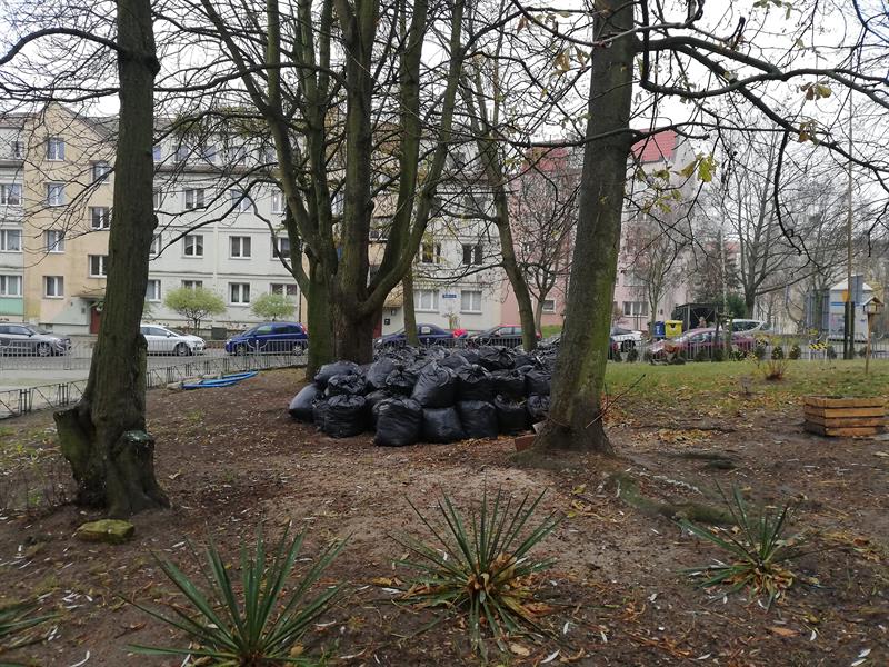 Skwer wysokich drzew ograbiony z liści. Choć zaledwie kilka kroków dalej - na pl. Guido Recka - miejskie służby przypominają: "Nie grabimy liści - chronimy zasoby przyrodnicze Szczecina".