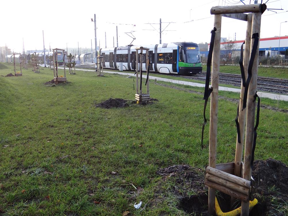 Dalej pas wykopu ciągnie się aż do wylotu w ul. Hangarową za nowy wiadukt drogowy z jezdnią wyjazdową z miasta. A w tamtejszym drzewostanie młodnika prawdziwa już rzeź. Po obu stronach urządzonych nowych enklaw z zielenią doliczyliśmy się następnych 37 miejsc gdzie, drzewka były, ale już ich nie ma. I tak krok po kroku aż za przystanek przy dąbskim lotnisku od kilku do kilkunastu jam bez drzew. Z kilkunastoma na finał w bezpośrednim sąsiedztwie nowej stacji energetycznej do zasilania trakcji tuż za pętlą na Basenie Górniczym.