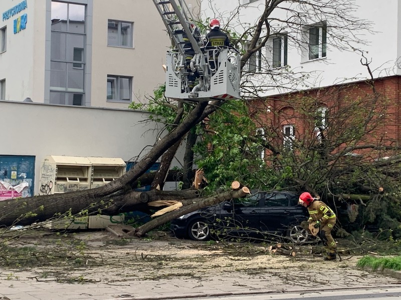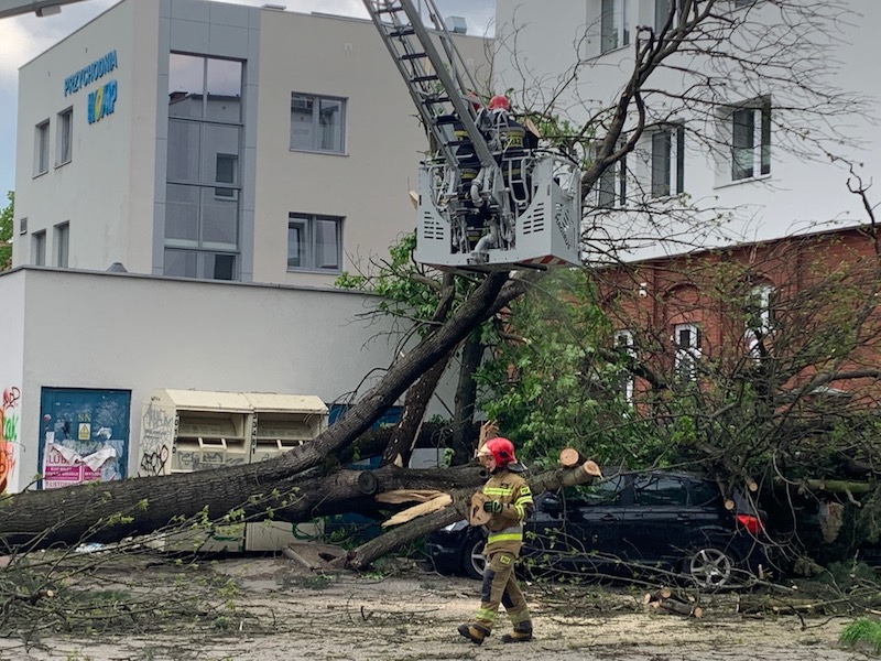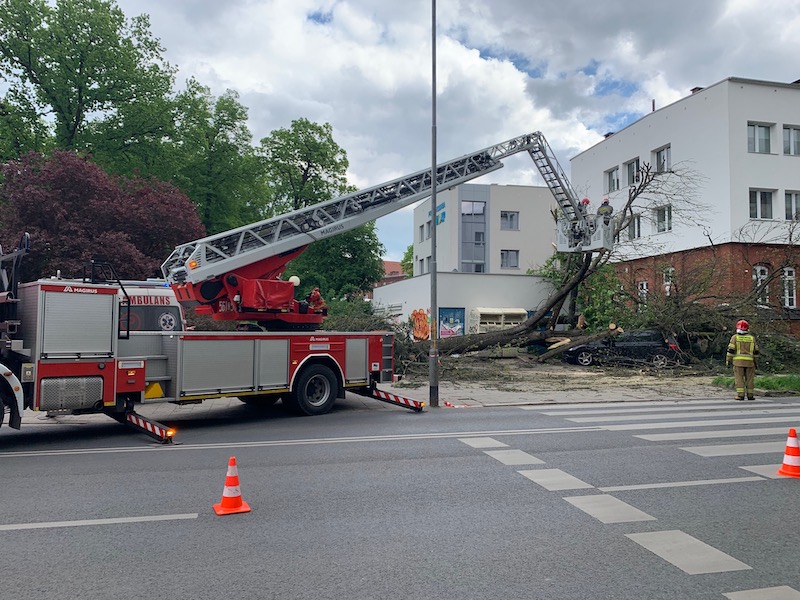 Strażacy usuwają właśnie drzewo, które zwaliło się na trzy samochody zaparkowane na chodniku przy ul. Kopernika w Szczecinie, na wysokości stacji benzynowej.