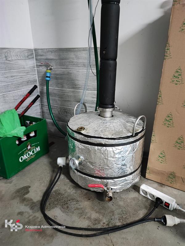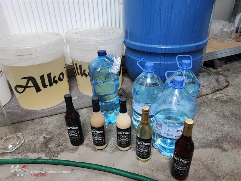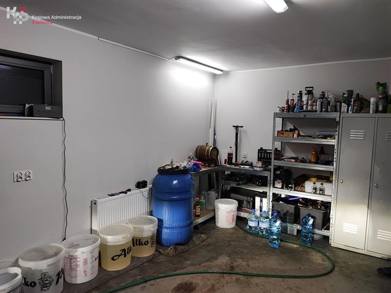 Pracownicy KAS, których w działaniach wspierali funkcjonariusze Żandarmerii Wojskowej, w garażu znaleźli w sumie 27 litrów alkoholu i 270 litrów zacieru do jego produkcji.