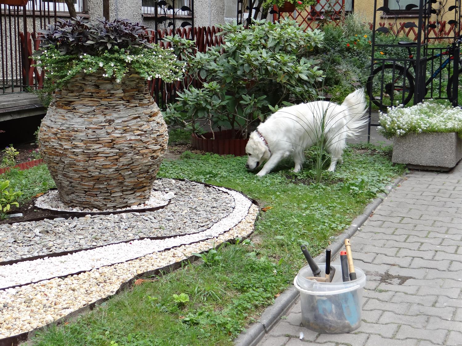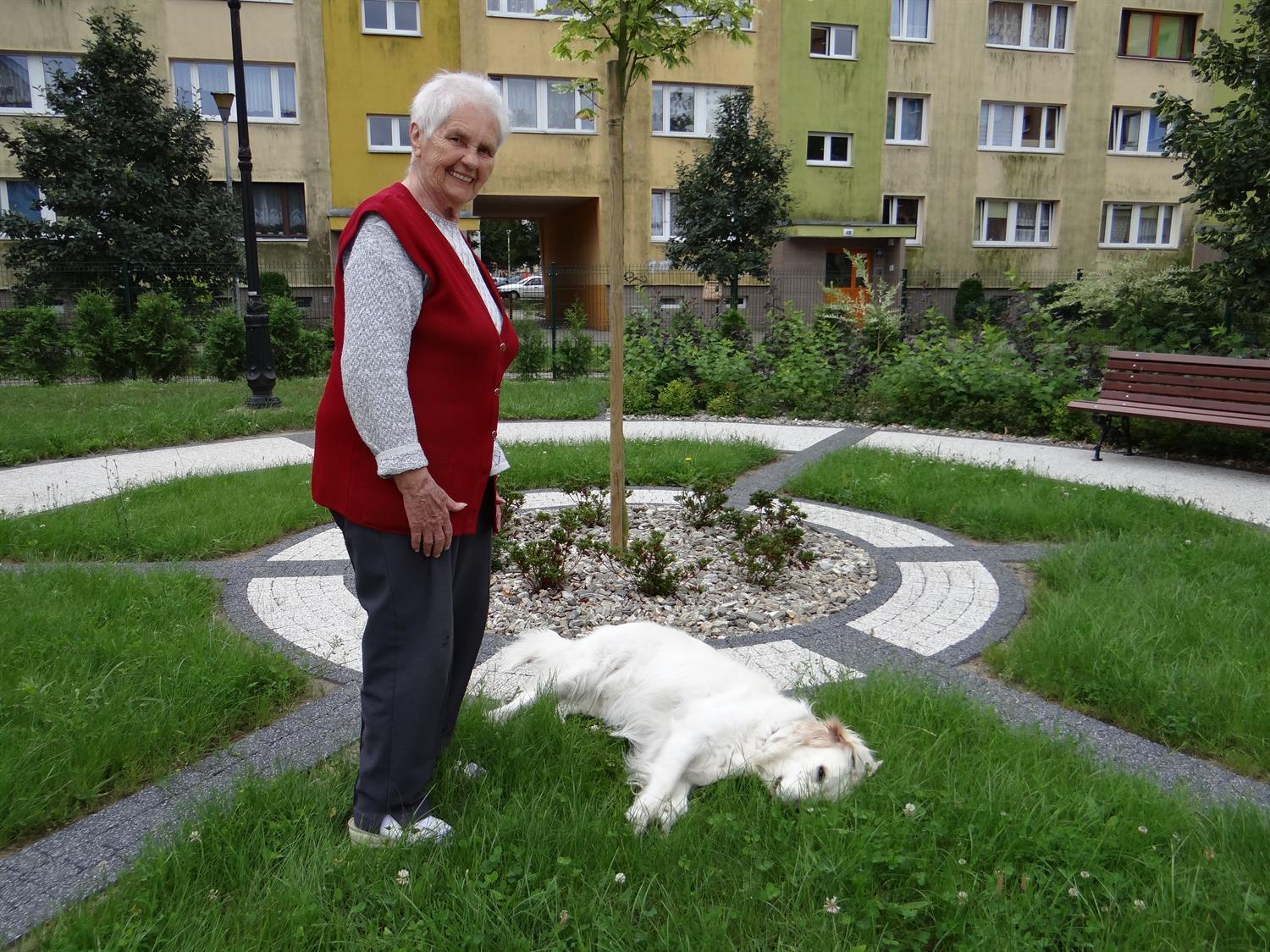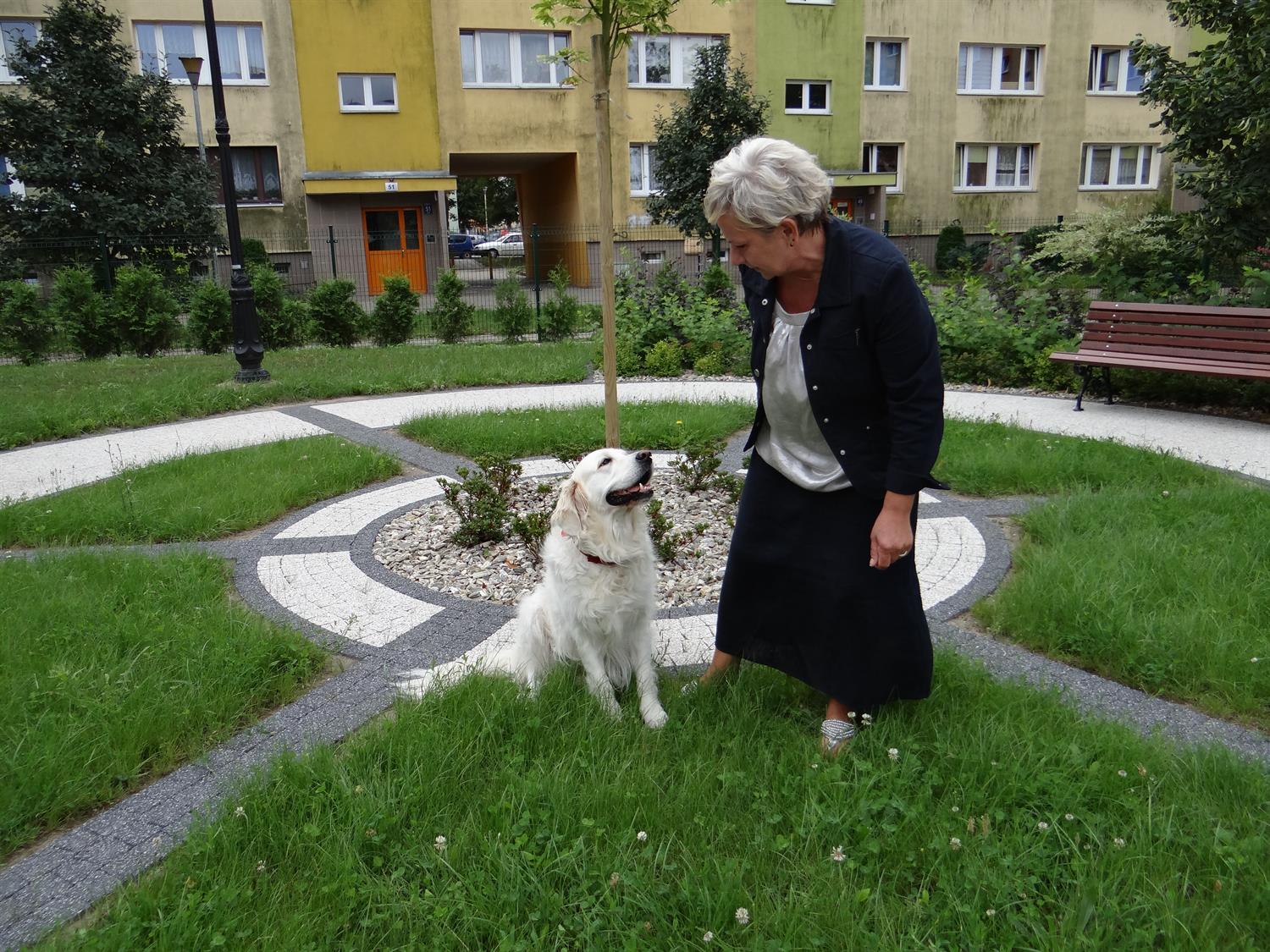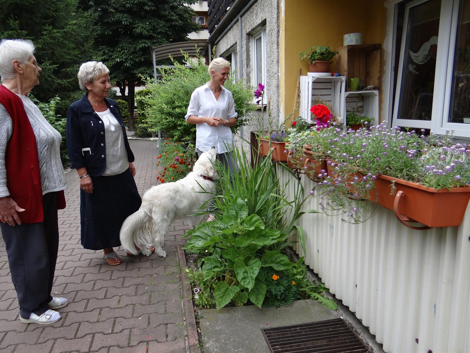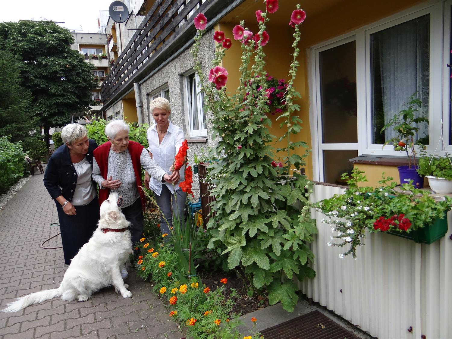 - Bo Molka, co wszyscy wiedzieć powinni, też ma swój wkład w urządzanie naszego grodu. Bywa że czasem coś wykopie, no to my po niej inne rośliny wsadzamy. Albo oberwie pączki lilii. Dla zabawy - opowiada pani Helena. - Tu, w ogrodzie, nasi pensjonariusze mają przestrzeń do wypoczynku, a na miarę sił i własnych możliwości do aktywnego spędzania czasu - dodaje Helena, której Molka na krok nie odstępuje.