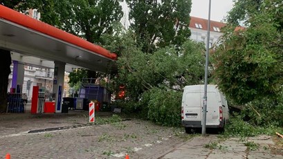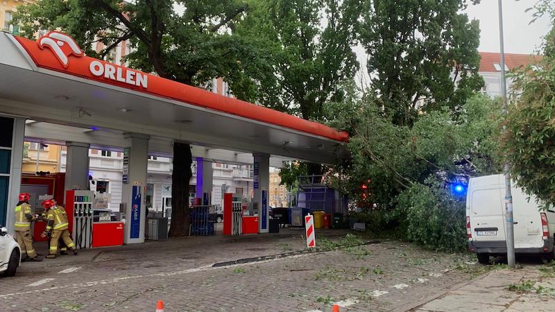 Przy ul. Mazurskiej tuż obok stacji benzynowej powalone drzewo spadło na chodnik, ulicę i zahaczyło o dach nad dystrybutorami z paliwem. Na szczęście nikomu nic się nie stało.