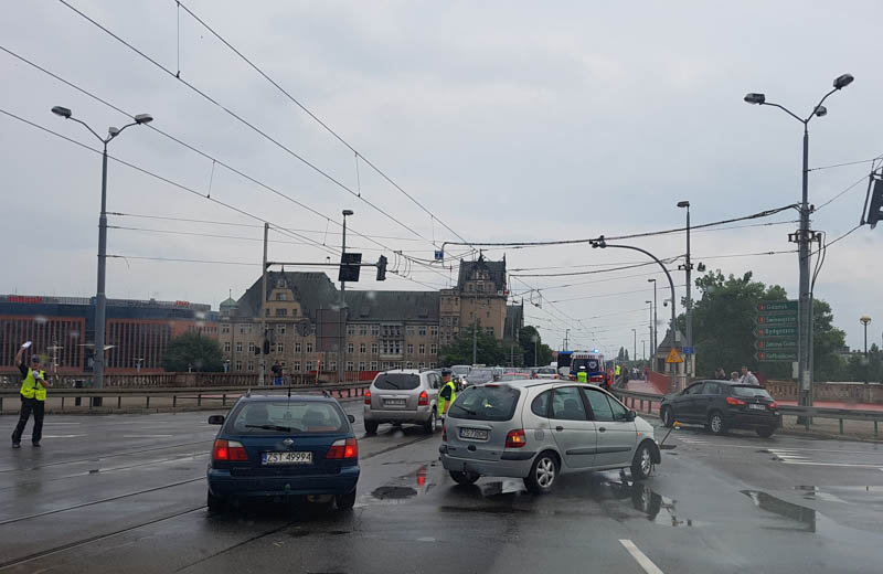 Przed godziną 19 na ul. Wyszyńskiego przy moście Długim zderzyły się trzy samochody - karetka pogotowia ratunkowego i dwa samochody osobowe.